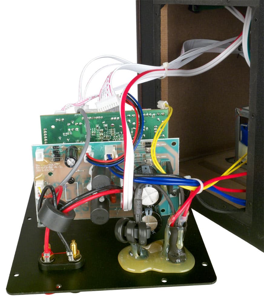 Платы с компонентами разделительных LC-фильтров закреплены на внутренних боковых стенках нижних отсеков обеих колонок. Активная колонка соединяется с пассивной кабелем с разъемами-«бананами» на обоих концах. Кабель достаточно толстый (к сожалению, соответствующей маркировки нет), в мягкой силиконовой оболочке, да к тому же очень длинный: целых четыре метра! Производитель тут явно решил не экономить. А имеющиеся на колонках винтовые зажимы можно использовать и для кабелей без наконечников.