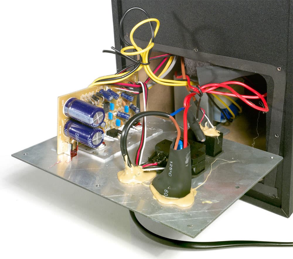 Съемная металлическая пластина служит и радиатором для усилителей, причем даже в отсутствие сигнала она заметно нагревается (на 13–14 °С относительно температуры в помещении) — сказывается ток покоя выходных каскадов УНЧ, а при работе нагрев еще сильнее, о чем даже есть предупреждающая надпись.