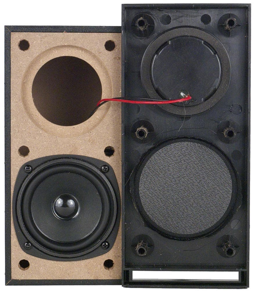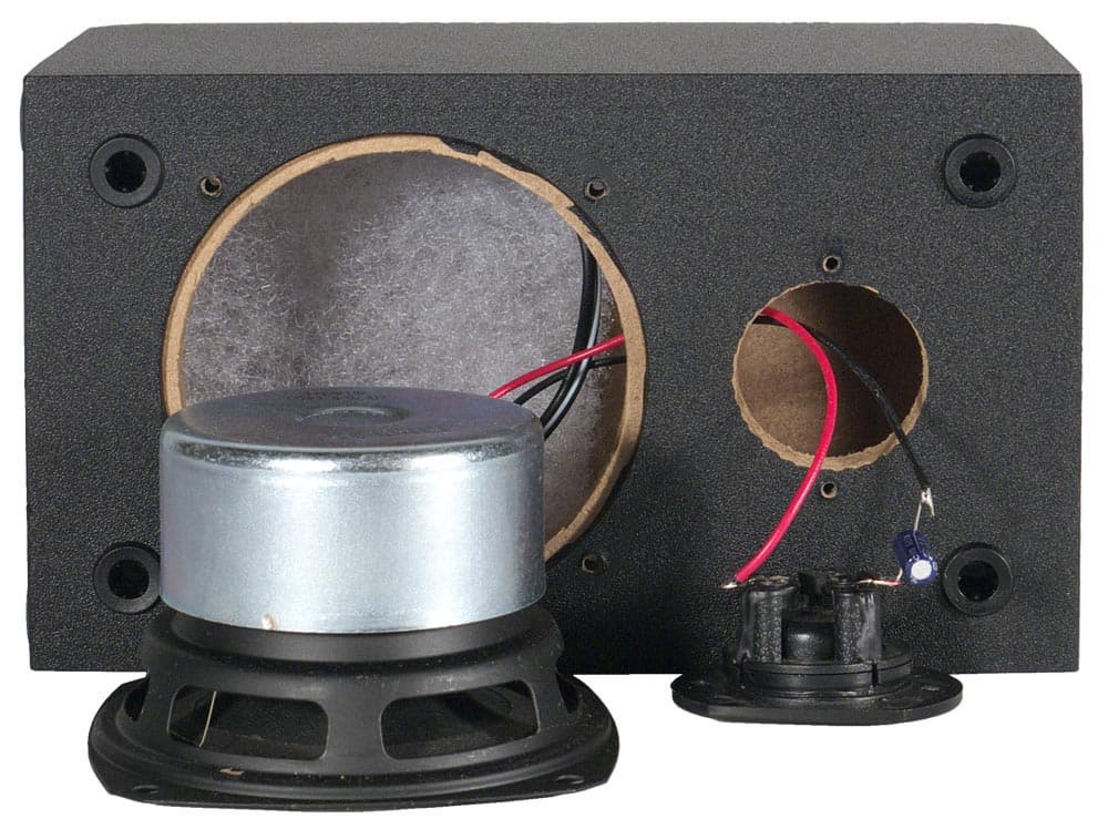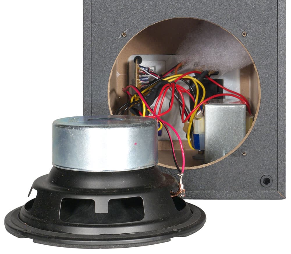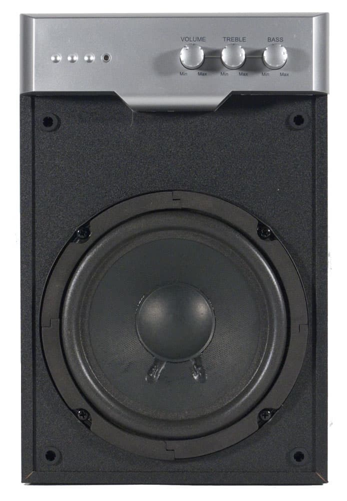 Толщина стенок сабвуфера составляет 12 мм, внутрь положен небольшой отрезок синтепона. Места стыков с корпусом как динамика, так и пластины с разъемами и электроникой на задней стенке снабжены уплотнителями. Выход фазоинвертора находится на задней стенке. НЧ-динамик с бумажным диффузором на полипропиленовом подвесе диаметром 14 см имеет сопротивление 4 Ом.