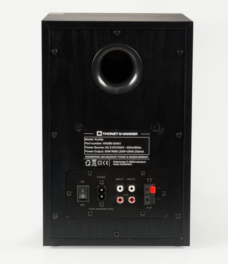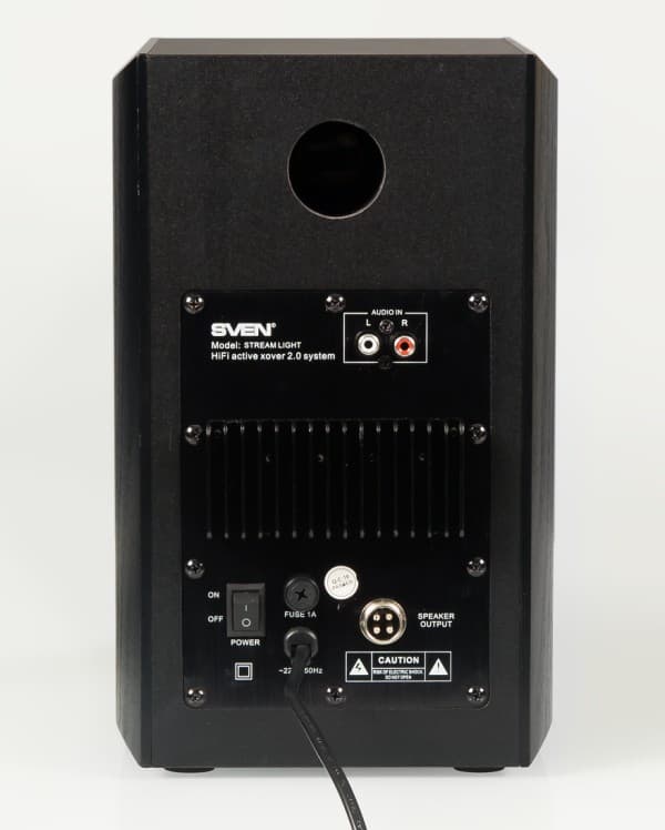 На металлической пластине, закрывающей через уплотнитель вырез в задней стенке активной колонки, снаружи находятся единственный вход 2×RCA, разъем для подключения пассивной колонки, механический выключатель питания и предохранитель, а также радиатор усилителя мощности. В самом низу — отверстие, через которое выведен кабель питания.