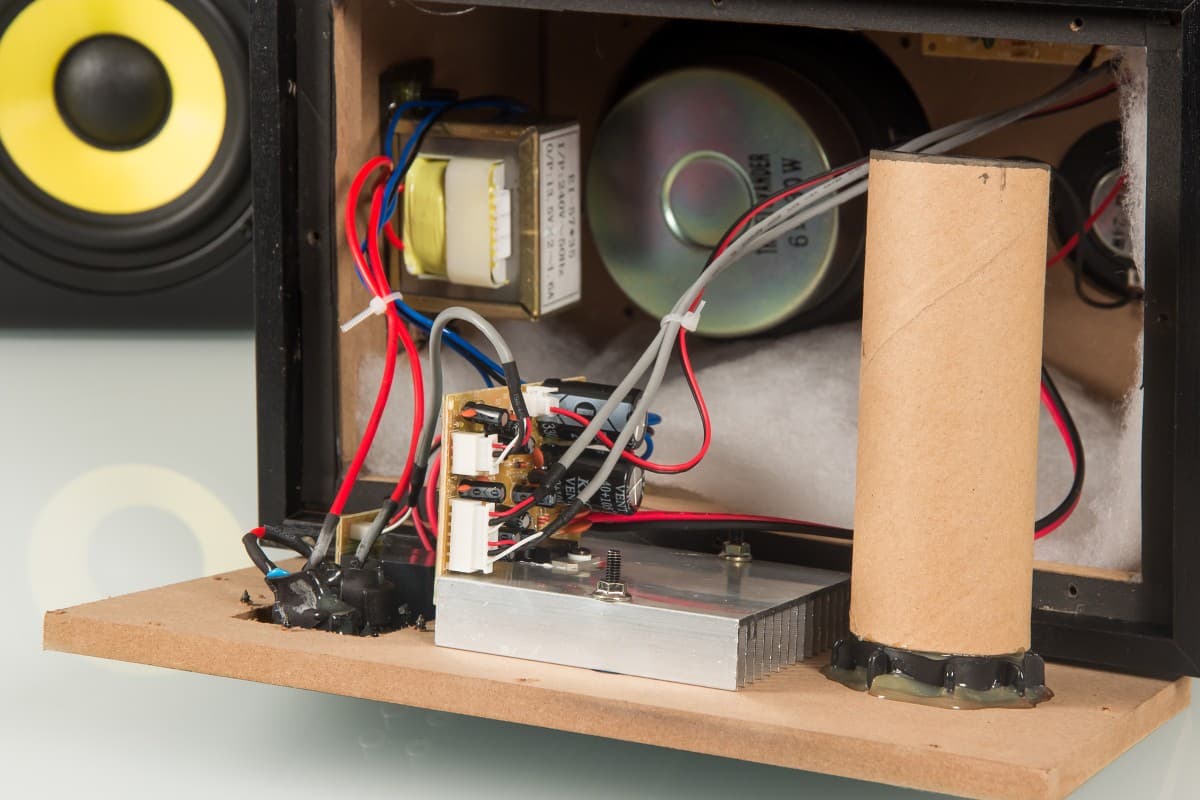 Толщина MDF, из которого изготовлены разные элементы корпуса, варьируется от 12 мм у фронтальной панели и 10 мм у боковых стенок до 9 мм у задней стенки. Причем заднюю стенку можно снять целиком, а привычная по множеству подобных моделей металлическая пластина тоже присутствует и тоже снимается, однако она очень небольшая и предназначена лишь для крепления различных разъемов и выключателя питания. Правда, уплотнителя для этой пластины не хватило, хотя места стыка с корпусом и обоих динамиков, и задней стенки уплотнены.
