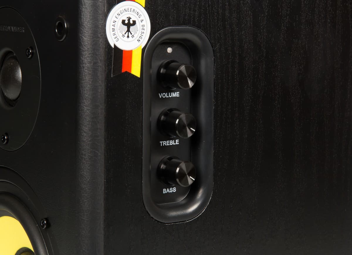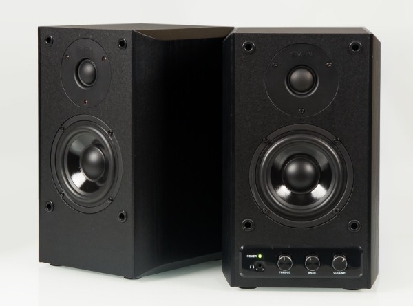 Корпуса колонок имеют боковые поверхности, ламинированные под дерево, причем если судить по информации на упаковке, покупатель может выбирать из четырех вариантов расцветки: орех, черный, вишня и темный дуб. Боковые панели не плоские, а немного скошены к краям, что добавляет колонкам элегантности. Остальные плоскости покрыты черным ламинатом с легким тиснением, а в нижней части фронтальной панели активной АС расположена панель управления из глянцевого пластика, на которой разместились регуляторы громкости и тембра НЧ/ВЧ, все с упорами в крайних положениях, а регуляторы тембра без фиксации среднего положения. Там же находится зеленый светодиод индикатора включения и гнездо выхода на наушники.