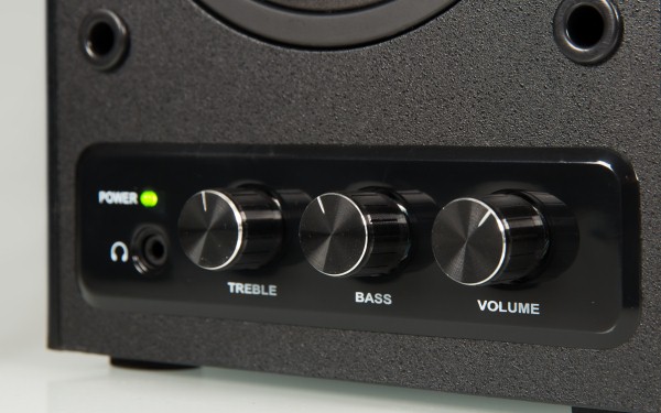 Место для органов управления выбрано, на наш взгляд, менее удачно, чем у Sven: на правом боку активной АС есть вырез, закрытый пластиковой панелью в форме корытца, на которой закреплены регуляторы громкости и тембра НЧ/ВЧ. Как и у Sven, регуляторы с упорами в крайних положениях и без фиксации среднего положения у регуляторов тембра. Там же есть и синий светодиодный индикатор питания, настолько яркий, что смотреть на него справа попросту трудно.