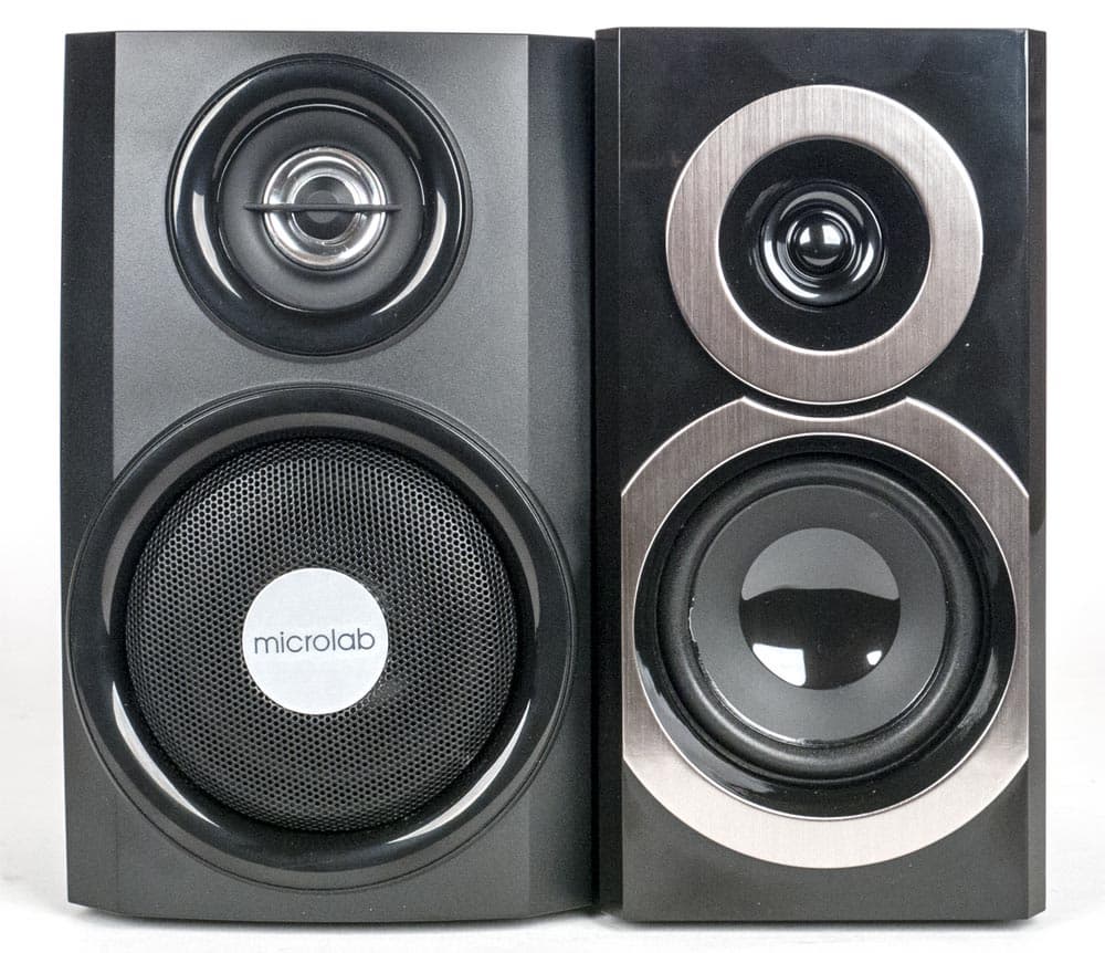 Доминирующий цвет колонок комплекта Microlab — матовый черный, лишь вокруг динамиков имеются глянцевые ободки, также черные. Сабвуфер почти кубический, сателлиты имеют вытянутую вверх форму. Фронтальные панели всех трех колонок декорированы накладками из пластика.