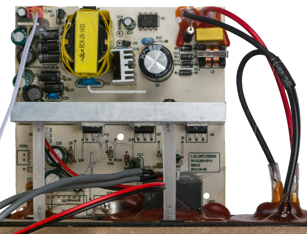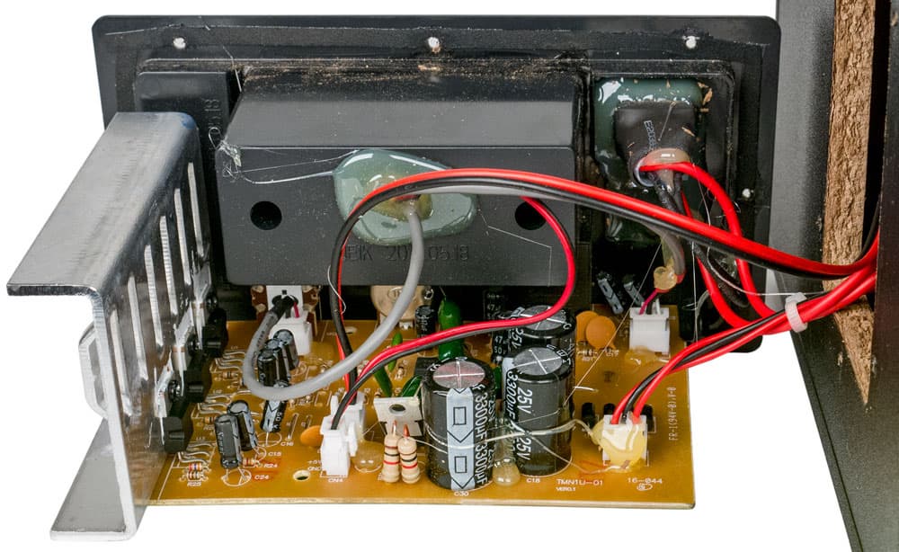 Усилитель и блок питания расположены на одной плате, закрепленной на съемной задней стенке сабвуфера. БП выполнен по схеме с преобразованием частоты, в отсутствие сигнала он выдает напряжение ±13,5 В для питания усилителя, в обоих плечах стоят конденсаторы 1000 мкФ.