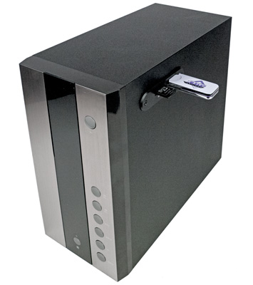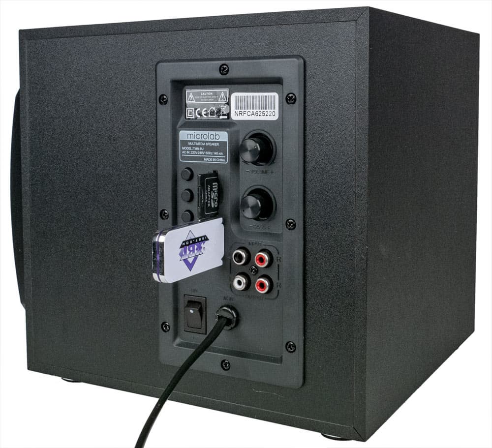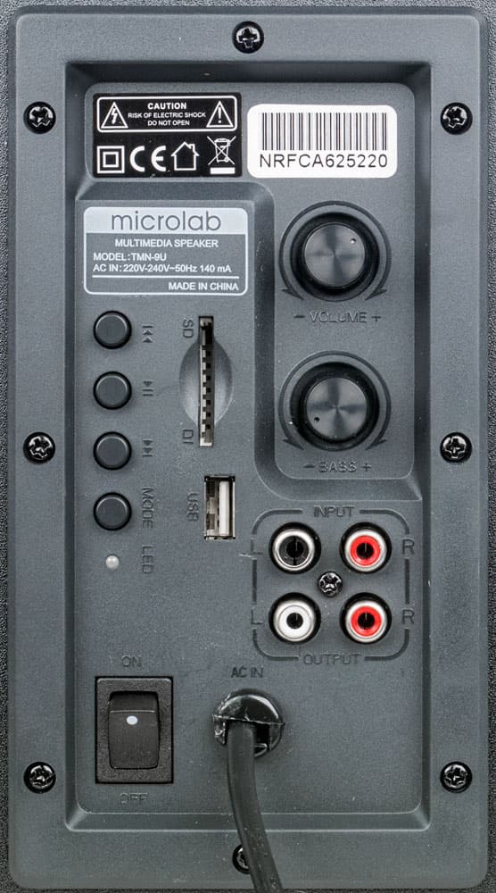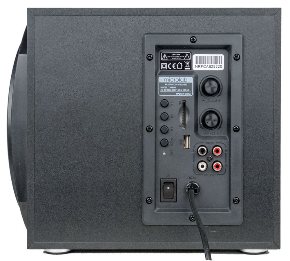Панель управления находится на пластиковой накладке, закрывающей отверстие в правой боковой стенке сабвуфера. Там имеются аналоговый вход 2×RCA, два таких же разъема для подключения сателлитов, коннекторы для SD-карты и USB-flash, два регулятора громкости (общей Volume и сабвуфера Bass, последний зачем-то с фиксацией среднего положения), четыре кнопки управления воспроизведением MP3-файлов и выбора источника, синий светодиодный индикатор, механический тумблер питания и выход сетевого кабеля с накладкой, защищающей от перетирания.