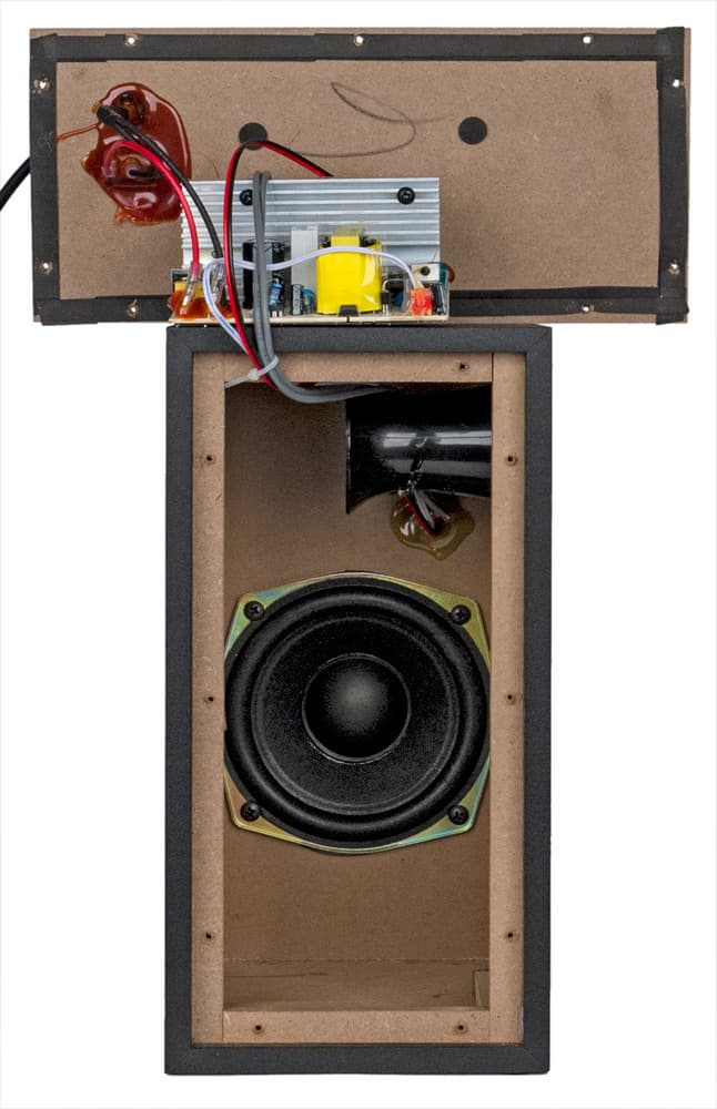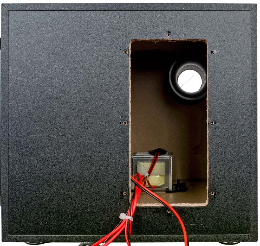Вся электроника расположена на одной плате, закрепленной на съемной крышке отверстия в правой стенке сабвуфера. Трансформатор закреплен через амортизирующие прокладки на днище корпуса.
