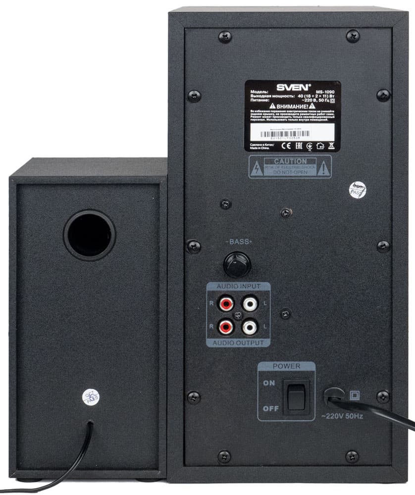 На задней стенке расположена пара RCA-коннекторов аналогового входа, еще два таких же разъема для подключения сателлитов и регулятор громкости сабвуфера. В нижней части находятся механический тумблер питания и отверстие для сетевого кабеля, снабженное защитой от перетирания.