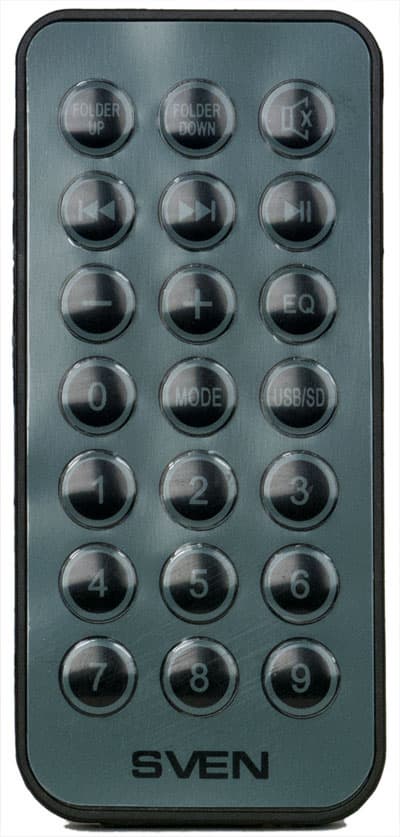 Как и комплект Microlab, модель Sven оснащена проигрывателем MP3-файлов, которые считываются со сменных носителей типа USB-flash или SD-карт. Поддерживается емкость до 32 гигабайт и работа с папками (переход между ними). Разъемы для подключения носителей находятся на правой боковой стенке сабвуфера, причем достаточно высоко: даже если рядом стоит сателлит или схожий по высоте предмет, он не помешает работе с носителями. При подключении флэшки или SD-карты автоматически начинается воспроизведение файлов с нее. При переходе от одного сменного носителя к другому или к аналоговому входу последний воспроизводимый музыкальный фрагмент запоминается, и после возврата к данному носителю он начинает воспроизводиться с начала.