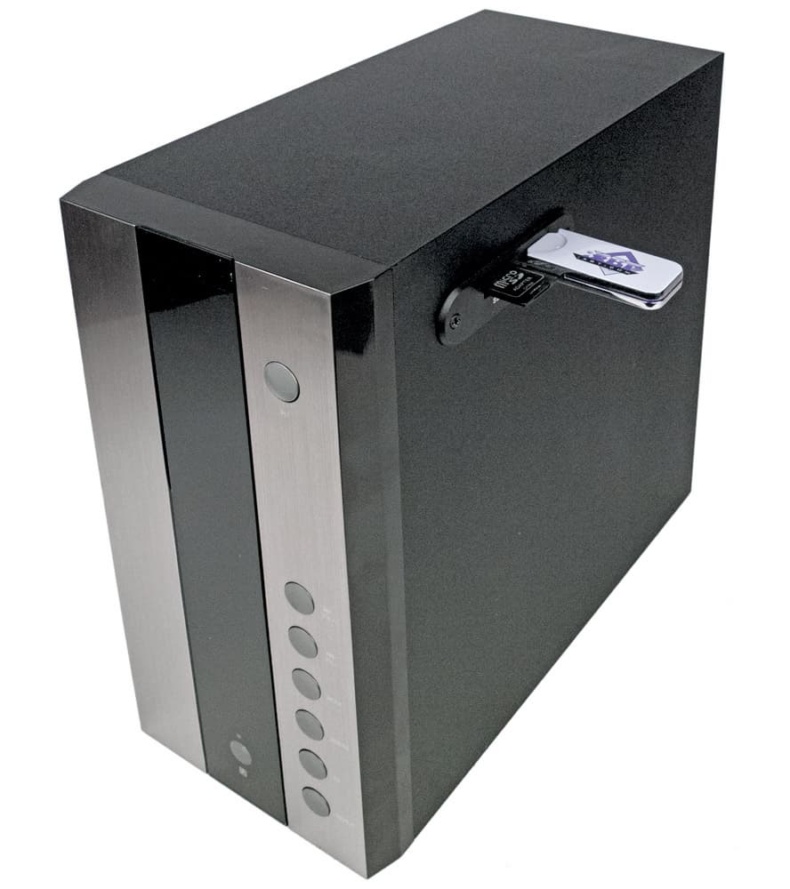 На правую часть лицевой панели сабвуфера вертикальным рядом выведены большие круглые кнопки, позволяющие изменять громкость, выбирать вход (внешний источник или USB/SD) и управлять воспроизведением MP3-файлов, включая выбор одного из двух носителей. Есть эквалайзер с набором фиксированных настроек, но он предназначен только для воспроизведения MP3.
