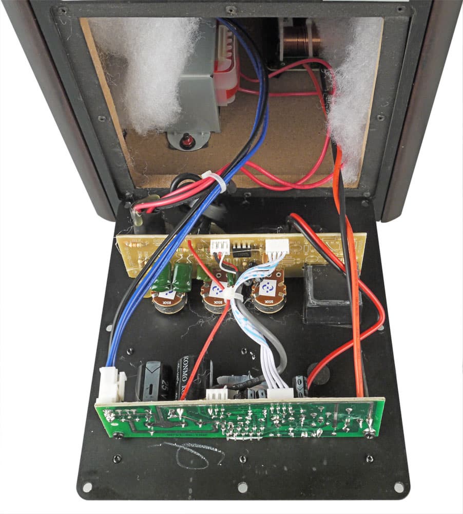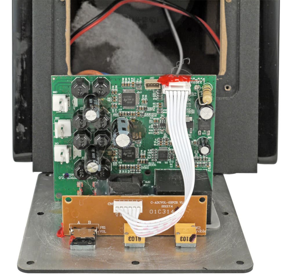 Электроника и тут размещена на трех платах, вот только назначение их совершенно иное: импульсный блок питания (на выходе 24 В в отсутствие сигнала) и собственно усилитель закреплены на упомянутой пластине и снимаются вместе с ней, а третья плата виднеется в глубине колонки — это панель управления. Соединения плат между собой и с динамиками сделаны на разъемах.