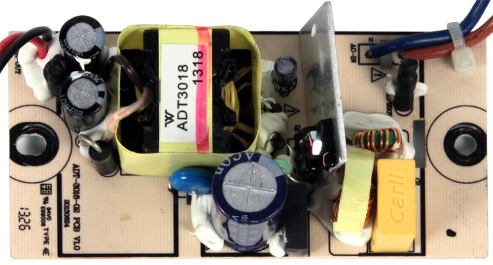 Импульсный блок питания не имеет внешнего экрана и очень похож на те, что мы не раз видели в недорогих мультимедийных колонках. Вновь выскажем сомнение в обоснованности выбора подобного БП с точки зрения воспроизведения пиков музыкальных сигналов, пусть и кратковременных, и отметим, что конденсатор в цепи питания УНЧ имеет емкость всего 1000 мкФ (что, кстати, тоже вполне обычное дело для недорогих моделей).