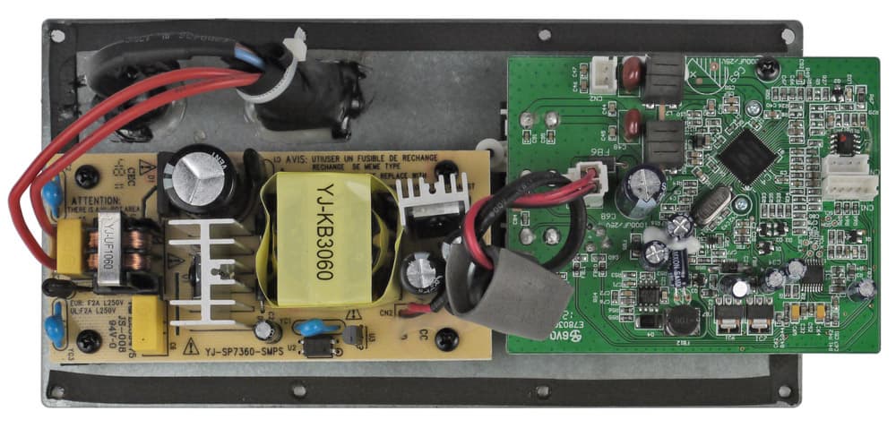 В схемотехнике сколь-нибудь принципиальных изменений также нет. Электронные компоненты разместились на трех платах, первая содержит усилитель мощности на сдвоенном интегральном УМЗЧ TDA7265 (ток покоя его выходных сигналов достаточно велик, и радиатор в месте крепления микросхемы нагревается в отсутствие сигнала на 9-10 °C), динамики подключены через LC-кроссовер (вторая плата). На третьей плате расположены предварительный усилитель на сдвоенном ОУ YG4558, а также пассивные цепи регулировки громкости и тембра; коммутация входов отсутствует. В общем и целом всё вполне соответствует возрасту конструкции: сделано просто и незатейливо, зато решения проверены временем. Ломаться там особо нечему, но даже в случае поломки исправить ее можно силами школьного кружка юных любителей техники, причем без существенных затрат. И трансформатор остался прежним: низкочастотный, на Ш-образных пластинах, с выходными параметрами 2×16 В 1,6 А. В цепях питания УНЧ установлены конденсаторы на 4700 мкФ — неплохо для данной ценовой категории!