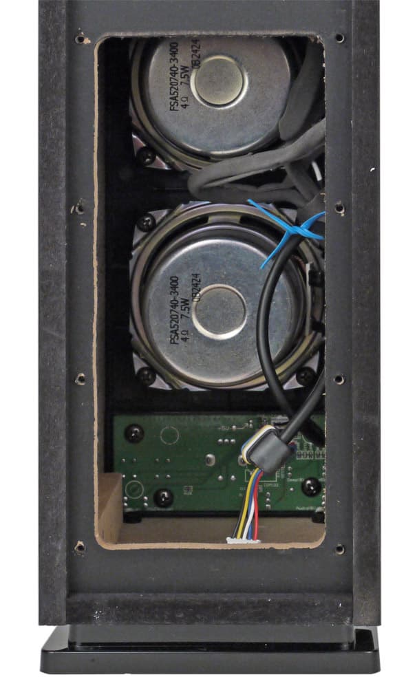 Отметим наличие уплотнителя в месте примыкания пластины к корпусу колонки, а также отсутствие внутри каких-либо звукопоглощаюших материалов, разве что часть кабелей завернута в нечто мягкое, но тонкое.