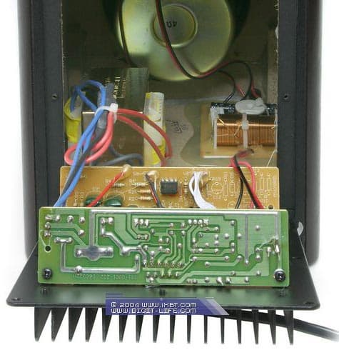 Цепи обработки и усиления сигналов сделаны на довольно свежей микросхеме D2-45057 производства Intersil, которая представляет собой целый «ансамбль» в одном корпусе — это и четырехканальный усилитель класса D, и цифровой процессор аудиосигналов с очень широкими возможностями, которые в данном случае используются лишь частично. Так, никакого би- или триампинга нет и в помине, хотя данная микросхема позволяет использовать кроссовер аж на пять каналов; соответственно усилители мощности, попарно объединенные в мостовые схемы, работают на все динамики колонки сразу, а в качестве кроссоверов выступают банальные конденсаторы, подвешенные на идущих к динамикам проводах. Из богатых возможностей обработки сигналов используются лишь три фиксированных эффекта: WideSound (расширение звукового пространства), DeepBass (подчеркивание нижних частот) и AudioAlign (труднообъяснимая функция, которую производитель заявляет как улучшение позиционирования звука в соответствии с видеоизображением), причем одновременно можно использовать только один из трех эффектов. Помимо этого, задействованы режим Mute и, конечно, встроенная функция работы с цифровым входом. Заданные установки сохраняются при переводе в режим Standby и последующем выходе из него.
