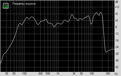 Судя по нашим измерениям, при неравномерности ±6 дБ рабочий диапазон Microlab Solo 1 составляет 65 Гц – 35 кГц. График АЧХ сравнительно ровный, однако следует отметить горб на 5 дБ в районе 2 кГц.
