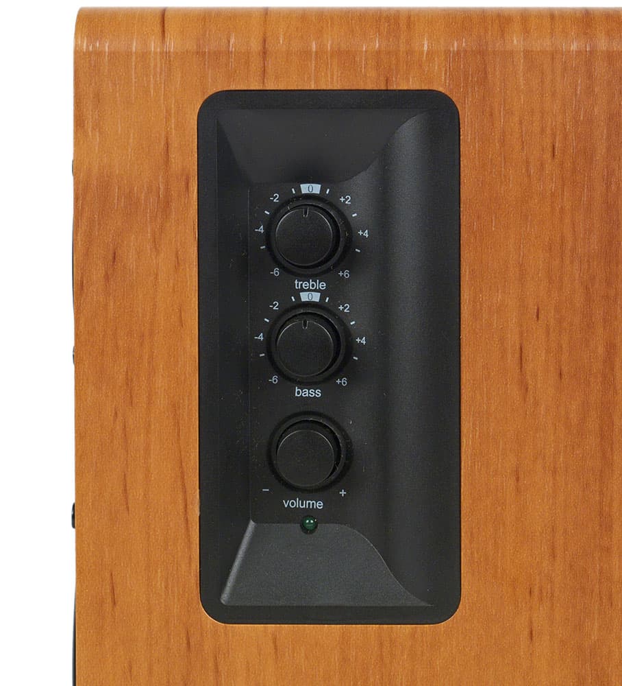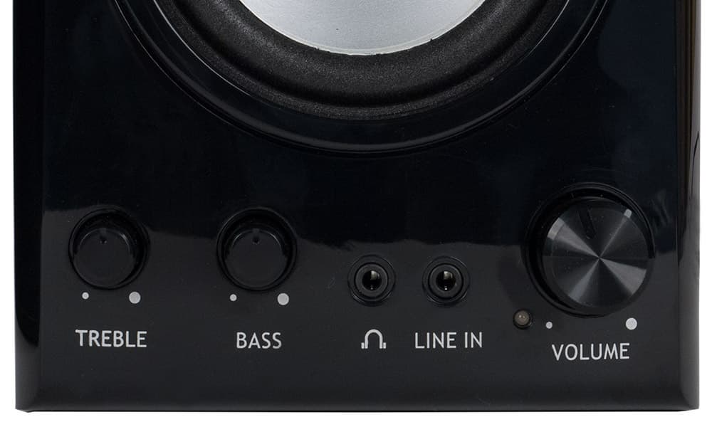 На панели управления три регулятора — громкости (покрупнее, справа) и тембра НЧ/ВЧ (поменьше, слева, с фиксацией среднего положения). Разделяют их два разъема mini-jack: дополнительный вход и выход на наушники, а также очень яркий синий светодиод индикатора включения. Пользоваться всем этим вполне удобно, и какие-то нарекания могут возникнуть лишь в маловероятном случае установки колонок на полу или на очень низкой подставке.