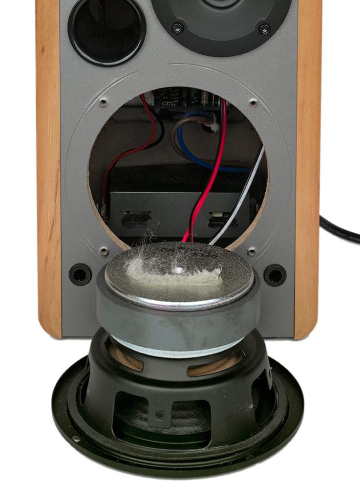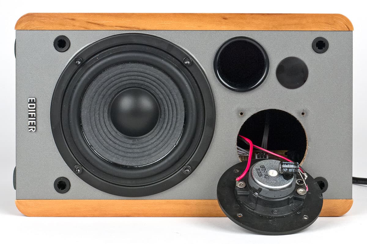 Диффузоры СЧ/НЧ-динамиков, по заверению производителя, сделаны из прессованной бумаги с вкраплениями шерсти. Проверить это, конечно, не представляется возможным, но внешне они действительно слегка пестрые, а при небольшом увеличении становится заметным волокнистая структура материала. Подвес резиновый, диаметр 9 см. Сопротивление 6 Ом.