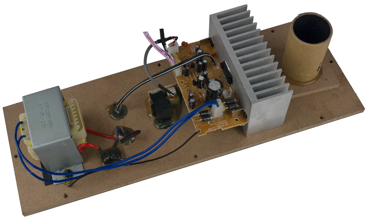 Схемы обработки и усиления сигнала аналоговые, все платы и компоненты (кроме регуляторов, конечно) закреплены изнутри на съемной задней панели активной АС. Питание реализовано на низкочастотном трансформаторе с Ш-образными пластинами, закрепленном через амортизирующую прокладку. Его вторичная обмотка выдает напряжение 15 В при токе 2,5 А. После выпрямительного моста установлен конденсатор на 4700 мкФ.