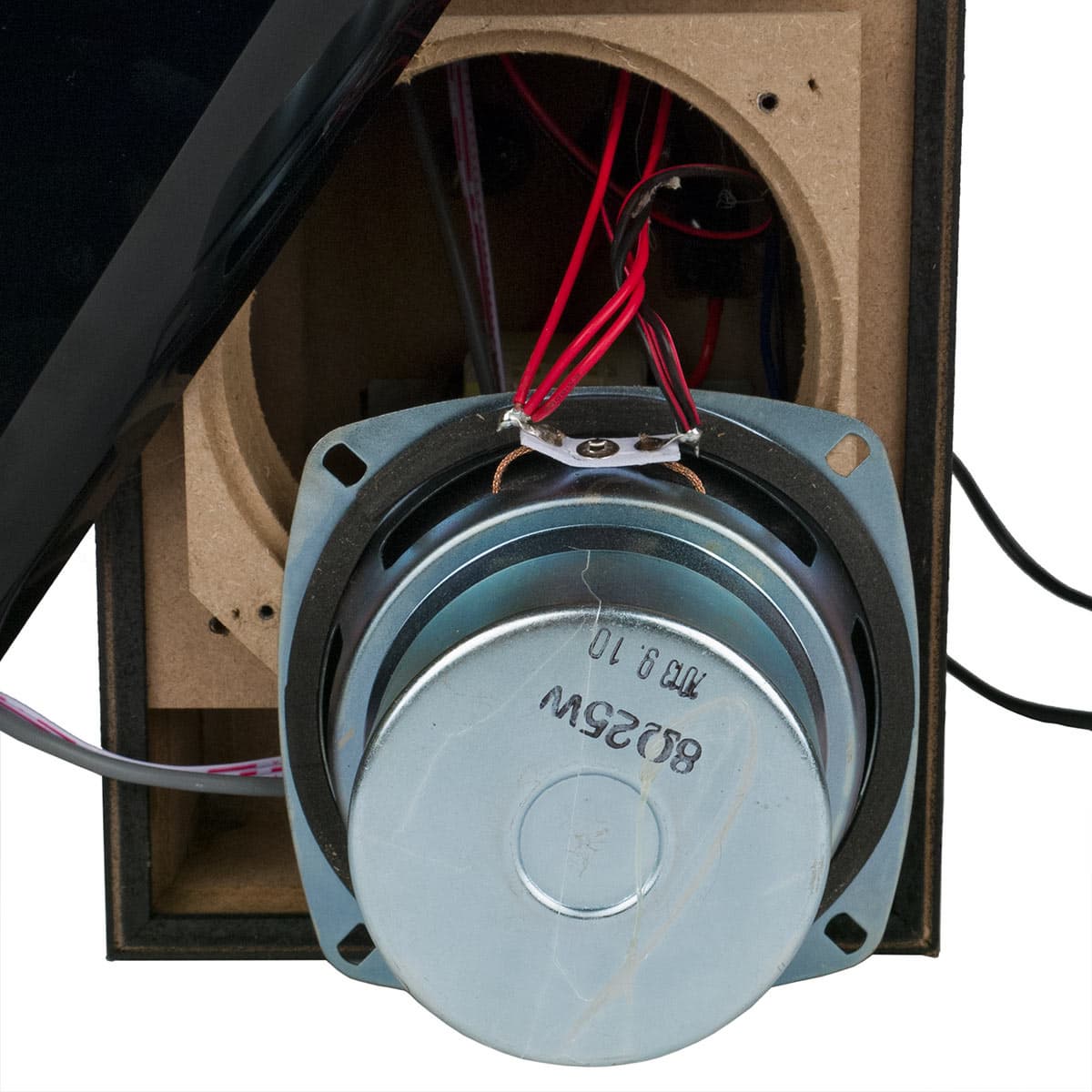 Электроника выполнена в двух блоках. Плата источника питания, сделанного по схеме с преобразованием частоты, расположена на днище активной колонки; БП в отсутствие сигнала на входах усилителя выдает 17 В. Внешнего экрана нет, есть только защитная оболочка, предотвращающая случайное прикосновение к высоковольтным цепям.