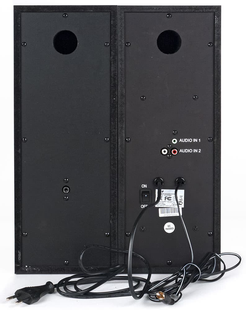 Входов два, оба аналоговые, выполнены с использованием разъемов RCA, закрепленных на металлической пластине, закрывающей вырез в задней стенке активной колонки. На ней же закреплены разъем с подпружиненными контактами для подключения пассивной колонки и механический выключатель питания. Кабель питания без разъема, но отверстие для него уплотнено изнутри и снабжено пластиковой накладкой, предотвращающей перетирание.