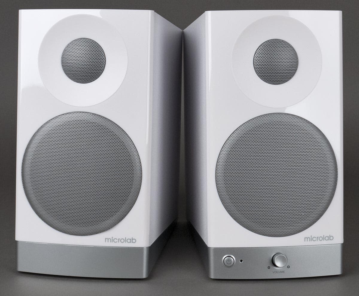 Если предыдущие участники выпускаются в единственном цветовом решении, то Microlab FC30 можно купить в двух вариантах: молочно-белый корпус с нижней частью, окрашенной под алюминий, и черный с ярко-красной нижней частью. Оба варианта смотрятся не то чтобы выигрышно, но уж точно выделяются в ряду привычных расцветок мультимедийных колонок.