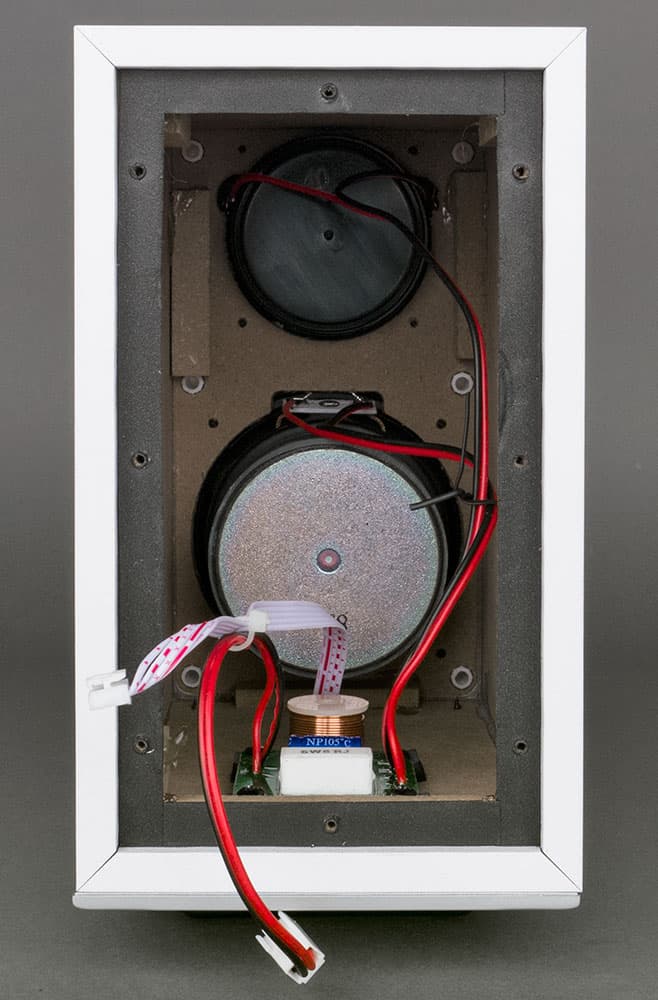 Как и у остальных рассмотренных колонок, для корпусов использован MDF толщиной 9 мм. Стыки как динамиков, так и задней металлической крышки с корпусом снабжены прокладками-уплотнителями, а звукопоглощающих материалов внутри нет.
