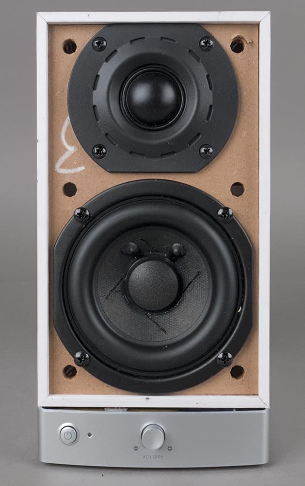 Динамики — СЧ/НЧ с бумажным диффузором на резиновом подвесе (диаметр 8,5 см, сопротивление 8 Ом) и твитер с тканевым куполом (1 дюйм, 4 Ом) — подключаются не через конденсатор, как в предыдущих двух моделях, а через более полноценный LC-фильтр, плата которого закреплена на днище колонки.