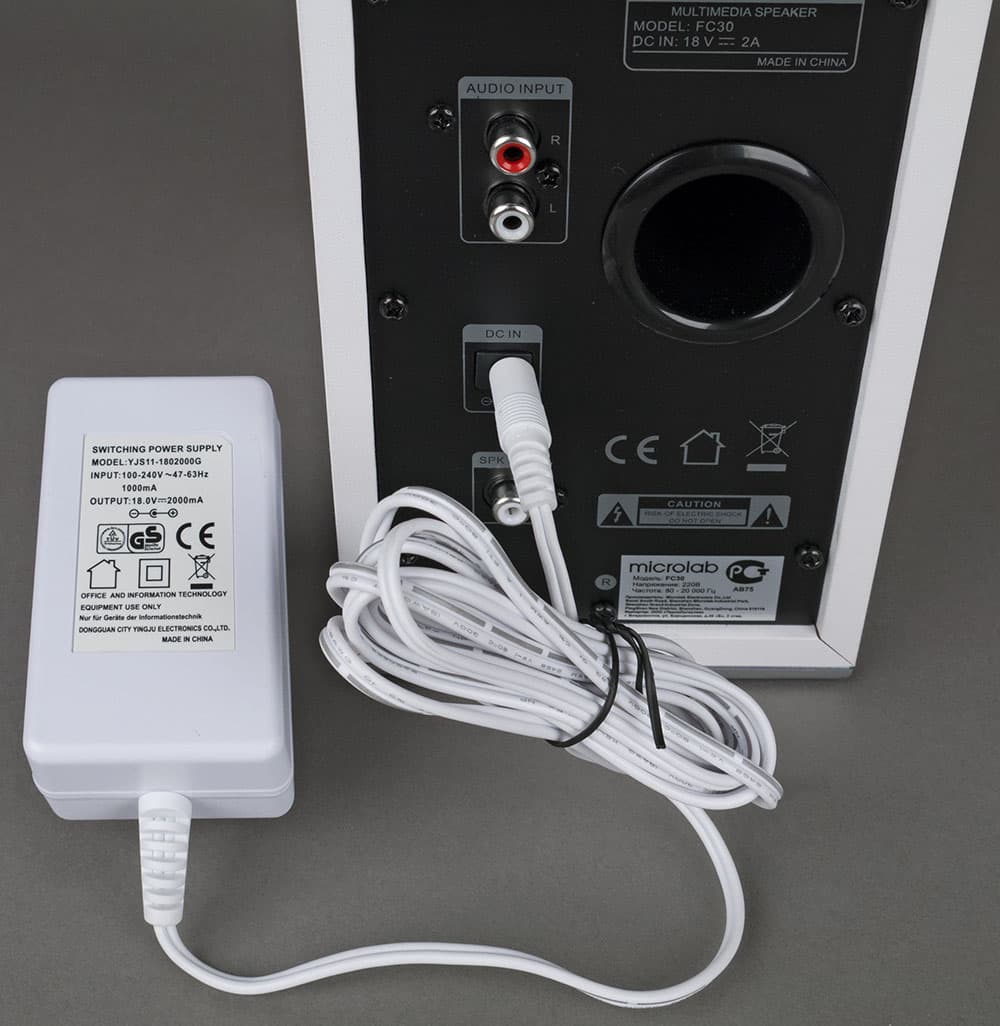 Еще один момент, выделяющий их среди аналогичных моделей — это выносной блок питания. Довольно странное решение: при современной схемотехнике подобное в основном встречается у совсем уж крошечных колонок.