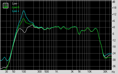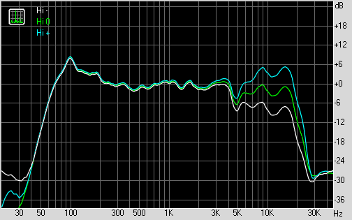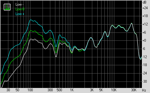 Наши измерения демонстрируют высокую изрезанность АЧХ во всем диапазоне. Регулировка высоких частот осуществляется в пределах ±6 дБ, низких — в пределах ±7 дБ.