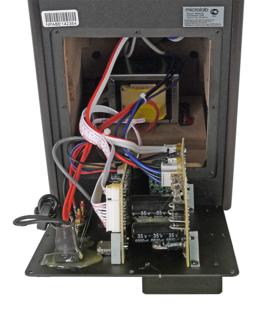 Электронная часть состоит из двух плат, закрепленных изнутри на металлической крышке, закрывающей вырез в задней стенке активной колонки через уплотняющую прокладку. На первой плате размещены цепи предварительного усиления, регулировок и коммутации. Вторая плата содержит усилители мощности, выполненные на дискретных элементах (это любимая «фишка» Microlab), и цепи их питания с выпрямителем и двумя конденсаторами по 6800 мкФ. На этой же плате расположены два предохранителя. Для выходных каскадов усилителей есть дополнительный пластинчатый радиатор.