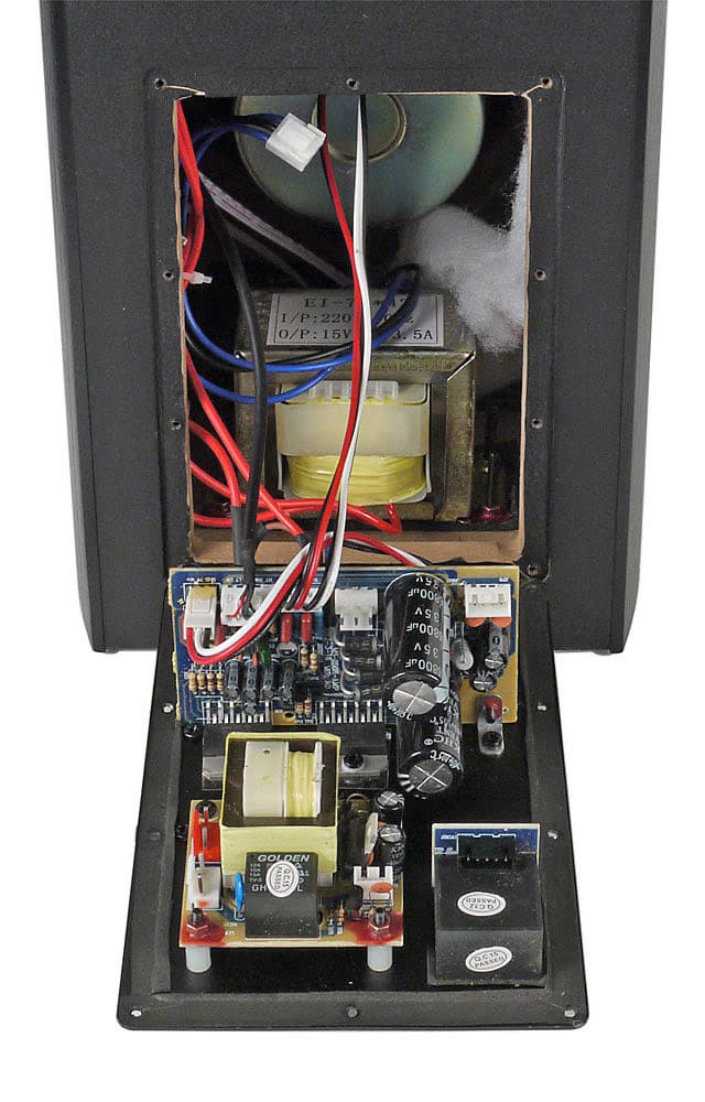 Электронная часть состоит из двух плат. Первая содержит цепи предварительного усиления и регулировок и закреплена изнутри на панели с регуляторами. Вторая плата содержит усилители мощности и цепи их питания с выпрямителем и двумя конденсаторами по 4700 мкФ. Сами усилители выполнены на двух микросхемах TDA2050, для охлаждения которых используется металлическая крышка выреза на задней стенке активной колонки с закрепленным на ней дополнительным пластинчатым радиатором. Уплотняющей прокладки по периметру выреза нет.