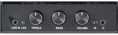 Цепи коммутации и регулировок расположены на третьей плате, которая закреплена с внутренней стороны панели управления. Управление громкостью и тембром НЧ/ВЧ осуществляется безупорными регуляторами. На панель управления выведены два разъема mini-jack — выхода усилителя для наушников и дополнительного входа, что дает возможность удобно и оперативно подключать различные устройства, прежде всего мобильные. Есть и светодиодный индикатор, постоянное свечение которого свидетельствует о включении колонок, а постоянные или кратковременные мигания — о режимах Standby/Mute или о том, что команда с пульта ДУ воспринята.
