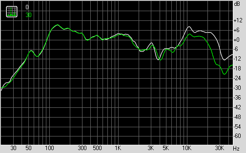 АЧХ колонки Konoos KNS-D400, измеренная на оси ВЧ-динамика и с отклонением 30°
