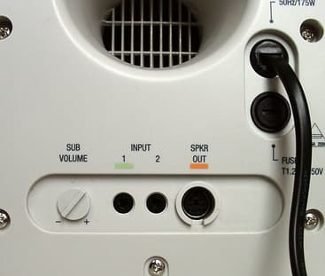 Уровень громкости сабвуфера регулируется отдельной ручкой, находящейся на задней панели. Сразу же представляется, как пользователь лезет под стол, чтобы отрегулировать громкость. Сзади также расположен разъем для подключения блока управления, который находится в одном из спикеров, и два входа (разъёмы миниджек). Эти входы эквивалентны друг другу. Если подавать сигналы одновременно с двух источников, они смешиваются.