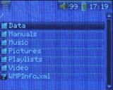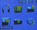 Пришло время включить новинку. Время включения составляет около трех секунд, что очень радует — не приходится долго зажимать кнопку, а потом смотреть поднадоевшую за время эксплуатации приветственную анимацию. Стиль оформления меню схож со стилем остальных моделей линейки — большие иконки, занимающие вполне приличное пространство экрана. Переключение между ними происходит, разумеется, 4х позиционной клавишей. Состоит меню из следующих пунктов: музыка, фото, видео, возобновить, браузер, установки.