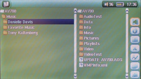 Единственное заметное изменение в режиме просмотра видео — очередное увеличение поддерживаемого разрешения — теперь доступно до 720×480 NTSC или 720х576 PAL (против 704×380 в AV400 и 640×348 в AV300). Поддерживаемые форматы в основном остались прежними — только MPEG4 SP. Впрочем, к DivX и XviD добавился и WMV9 SP, но с тестовыми файлами устройство не справилось (часть результатов, полученных при помощи DivXTestCD, приведена по ссылке), а в магазинах пока доступного контента в этом формате не так много, причем чаще всего он не рассчитан под 16:9. На месте все сервисные возможности типа закладок и т.п.