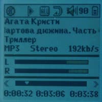 Следующая строка предназначена для отображения другой информации о текущем файле: формат сжатия, канальность и битрейт (средний в случае VBR). В последней строке можно увидеть текущую позицию воспроизведения, время до конца файла и его общую длину в минутах и секундах, а чуть выше — нечто подобное в графическом виде. Поскольку места на экране много, оставшаяся его часть отведена для демонстрации уровня в каждом из каналов. Судя по всему, носит это изобразительный, а не информативный характер — так показания «индикаторов» несколько отличаются при воспроизведении «честных» монофонических файлов, чего по логике вещей быть не должно.