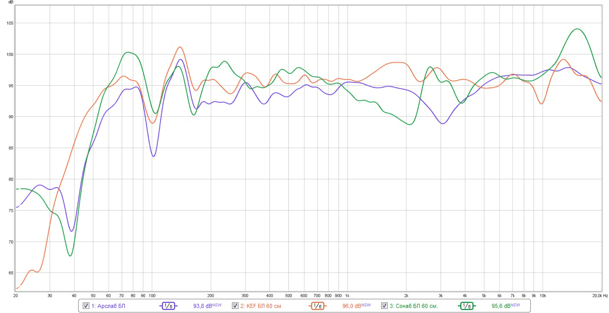 Для проверки природы возникновения провала в районе 100 Гц и последующего подъема в районе 150 Гц были замерены в тех же условиях еще 2 колонки (KEF Xq40 и Sonab B32), и график на этих частотах получился похожим. Из чего можно сделать вывод, что полностью избавиться от влияния помещения, даже при замерах в ближнем поле, нам не удалось.