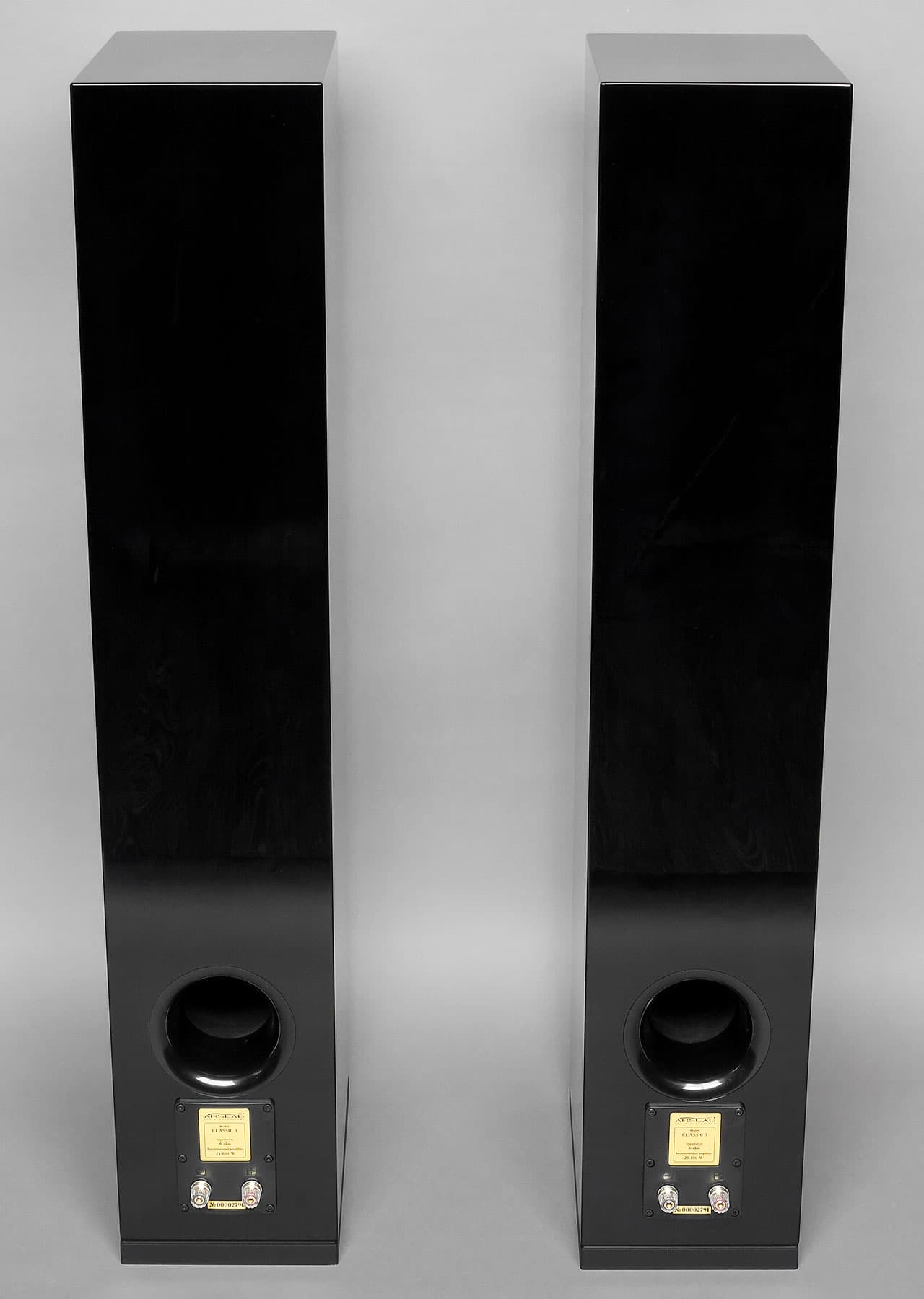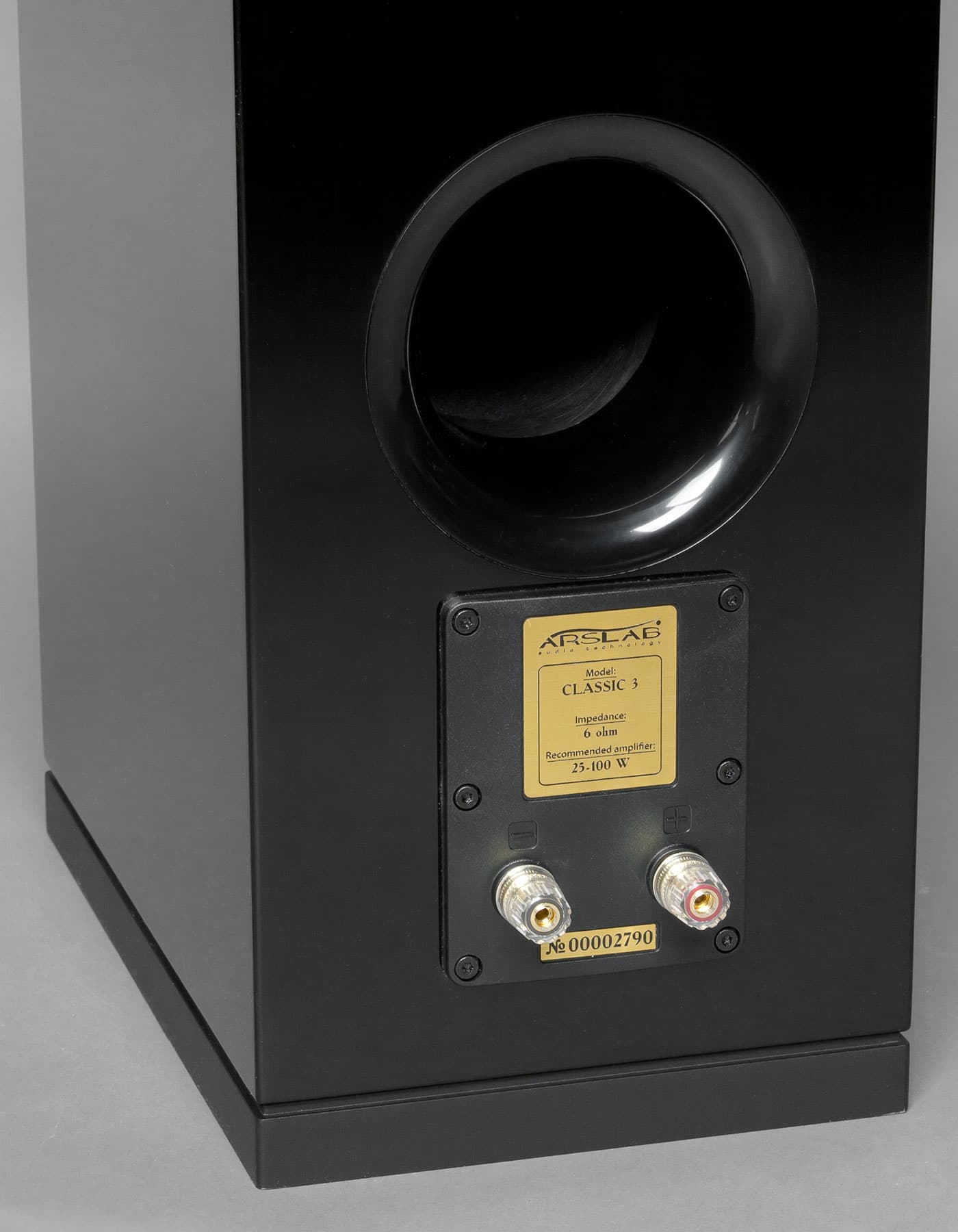 Порт фазоинвертора внушительного размера выведен назад. Под ним пара удобно расположенных клемм для подключения акустических кабелей. На фасаде под грилем (декоративной решеткой) обнаруживаем купольный твитер диаметром 30 мм, один СЧ-излучатель с фазовыравнивающей пулей и 2 НЧ-драйвера. Все динамики, кроме твитера, имеют диаметр 168 мм и производятся компанией Wavecor. Также есть версия колонок с индексом SE, в которой установлен ленточный твитер. Параметры Arslab Classic 3: сопротивление 6 Ом, чувствительность 88 дБ, частотный диапазон 40 Гц — 22 кГц.