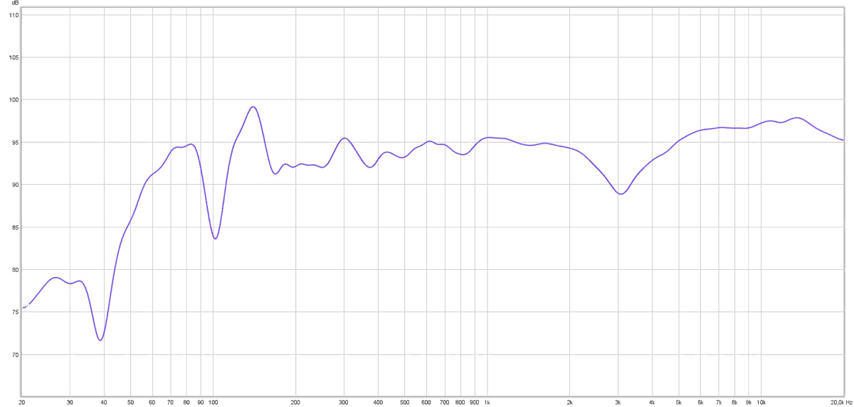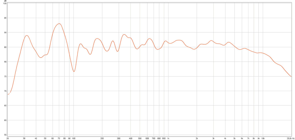 На графике АЧХ, снятом на расстоянии 60 см от колонки, можно наблюдать ощутимый провал АЧХ в районе 3 кГц. Предположительно это связано с настройкой кроссовера на стыке полос. На расстоянии 100 см этот провал уже сглажен, а в точке прослушивания не наблюдается вовсе.