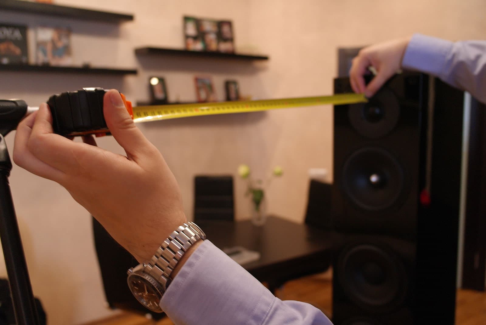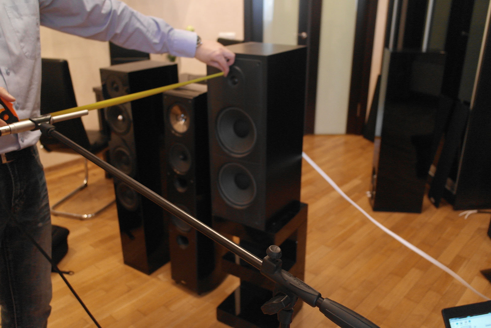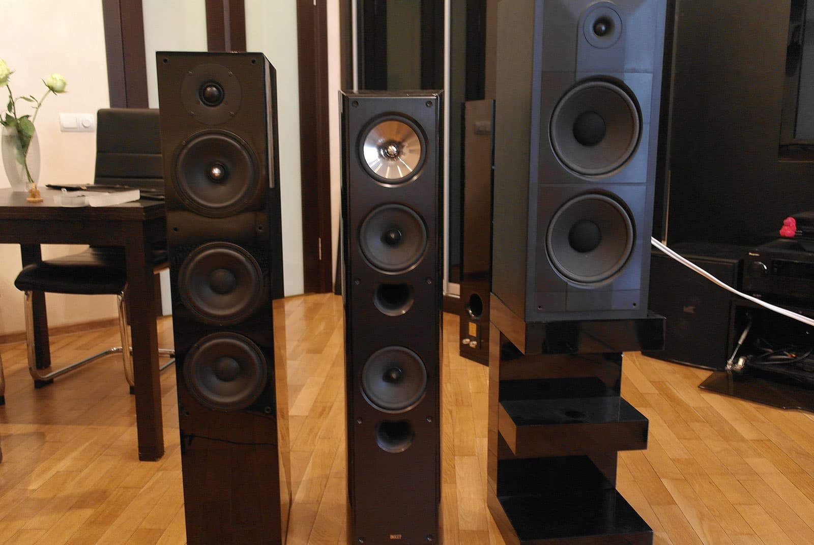 Мы решили провести измерения в условиях, приближенных к реальным. Спасибо Сергею Рубанову за аппаратуру для измерений и грамотные замеры. Установили колонки на подиум в центре жилого помещения площадью 26 м² с типичной мебелью (ТВ, диван, шкаф, стол, стулья). Замеры проводились в ближнем поле: два замера на расстоянии 60 см и 1 м от колонки и один замер в типичной для такого помещения точке прослушивания (около 2,5 м от колонки).