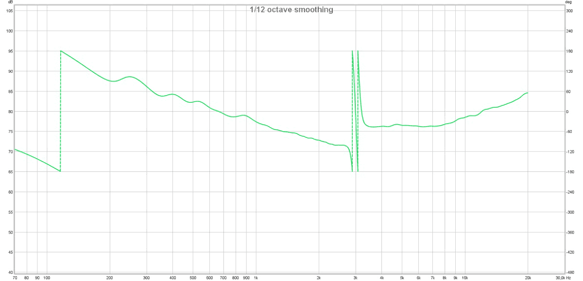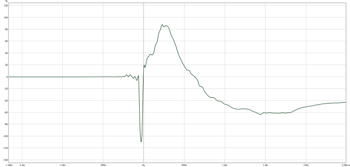 Кроссовер имеет конструкцию, влияющую на частоте раздела на фазу и на импульс. Видно, что на частоте раздела 3 кГц фаза крутится, и что ВЧ имеют другую полярность подключения, чем СЧ/НЧ-секции. Как упоминалось выше, в точке прослушивания провал на 3 кГц отсутствует, а на слух услышать негативное влияние кручения фазы нам не удалось.