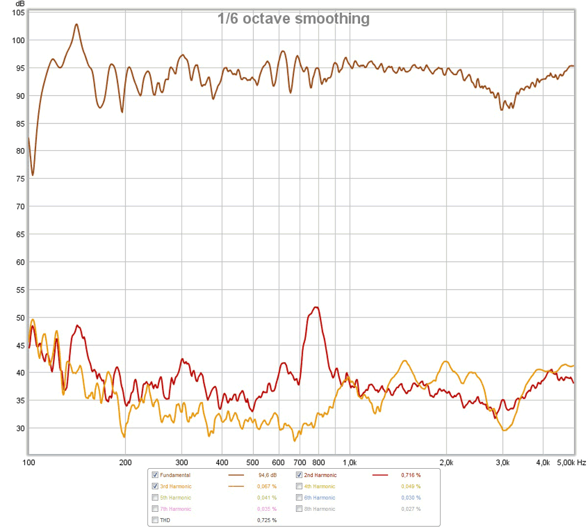 На последнем графике виден пик искажений около 800 Гц, который может быть вызван как особенностью сшивки СЧ/НЧ-полос так и резонансами в помещении.