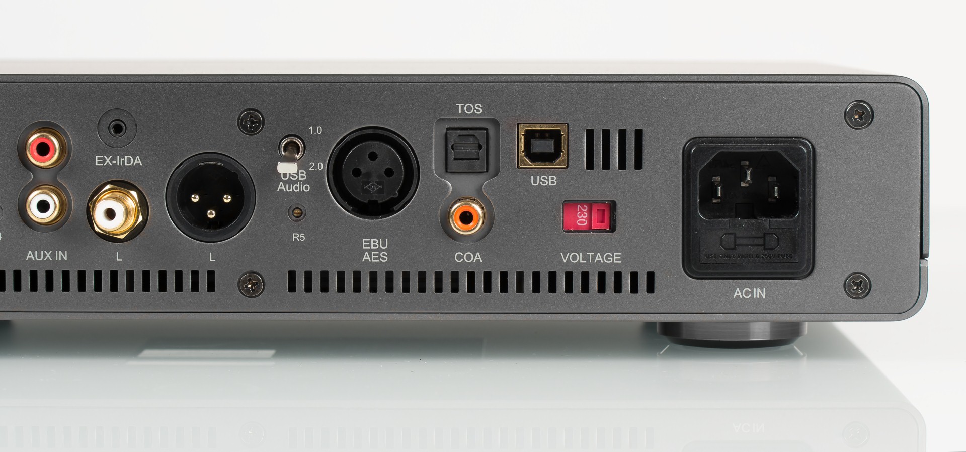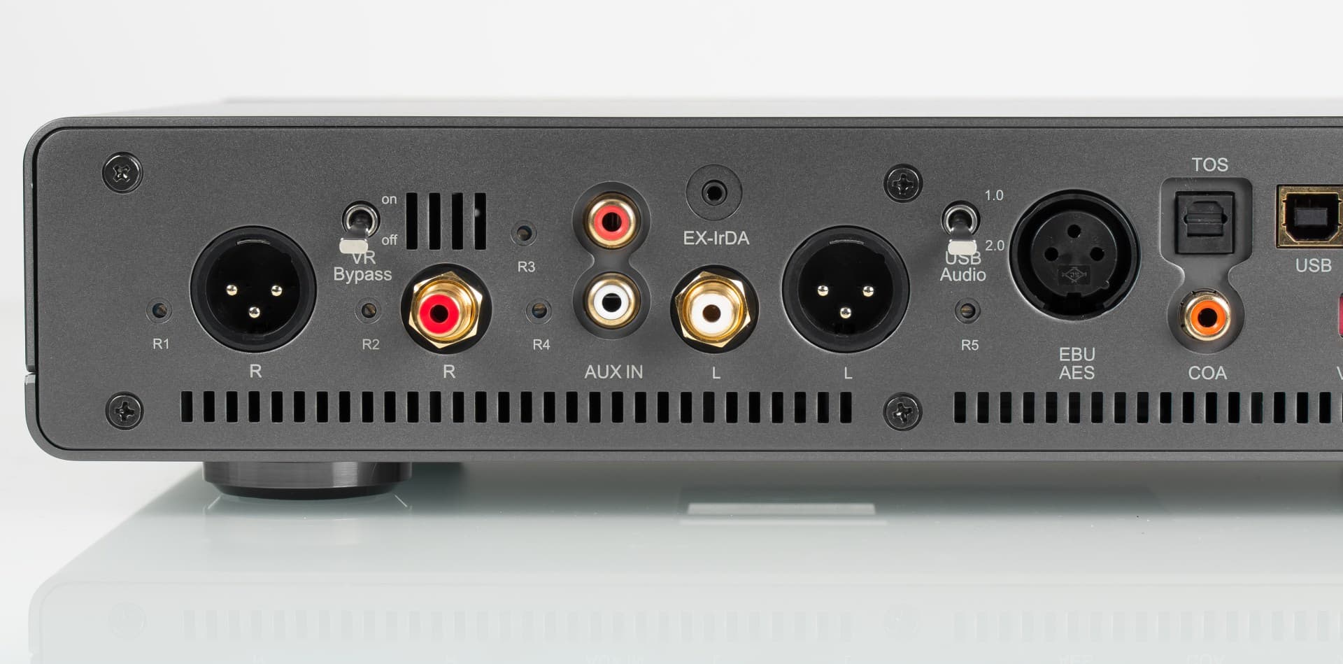 Возможности аналогового подключения: балансные XLR- и небалансные RCA-выходы, линейный вход, тумблер отключения цепей регулировки громкости. 4 цифровых интерфейса, профессиональный цифровой AES-вход, оптический Toslink и коаксиальный S/PDIF, USB, поддерживают любые форматы сигнала на входе от 44 до 192 кГц.
