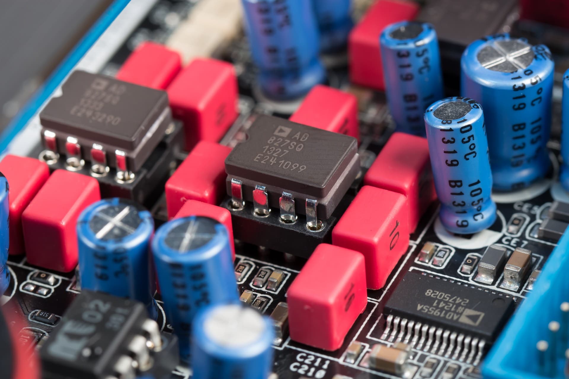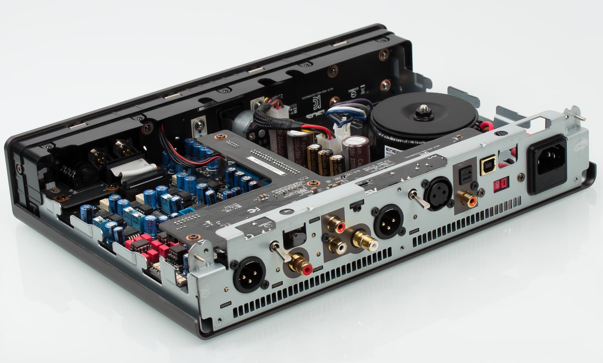 Использованные компоненты: ЦАП ADI AD1955, конденсаторы WIMA FKP2, стабилизаторы TI TPS 7A4700 и 7A3301, усилитель для наушников на базе TI LME49600 с поддержкой нагрузки 600 Ом, высокостабильные с низкими искажениями операционники ADI AD827SQ в керамических корпусах, специальные аудиофильские операционники JRC Muse02 с технологией ASD снижения проникновения каналов, в цепях DC Servo стоят специально для этой цели подобранные операционники TI OPA2227P. Благодаря DIP8-корпусам все ОУ заменяются без пайки.