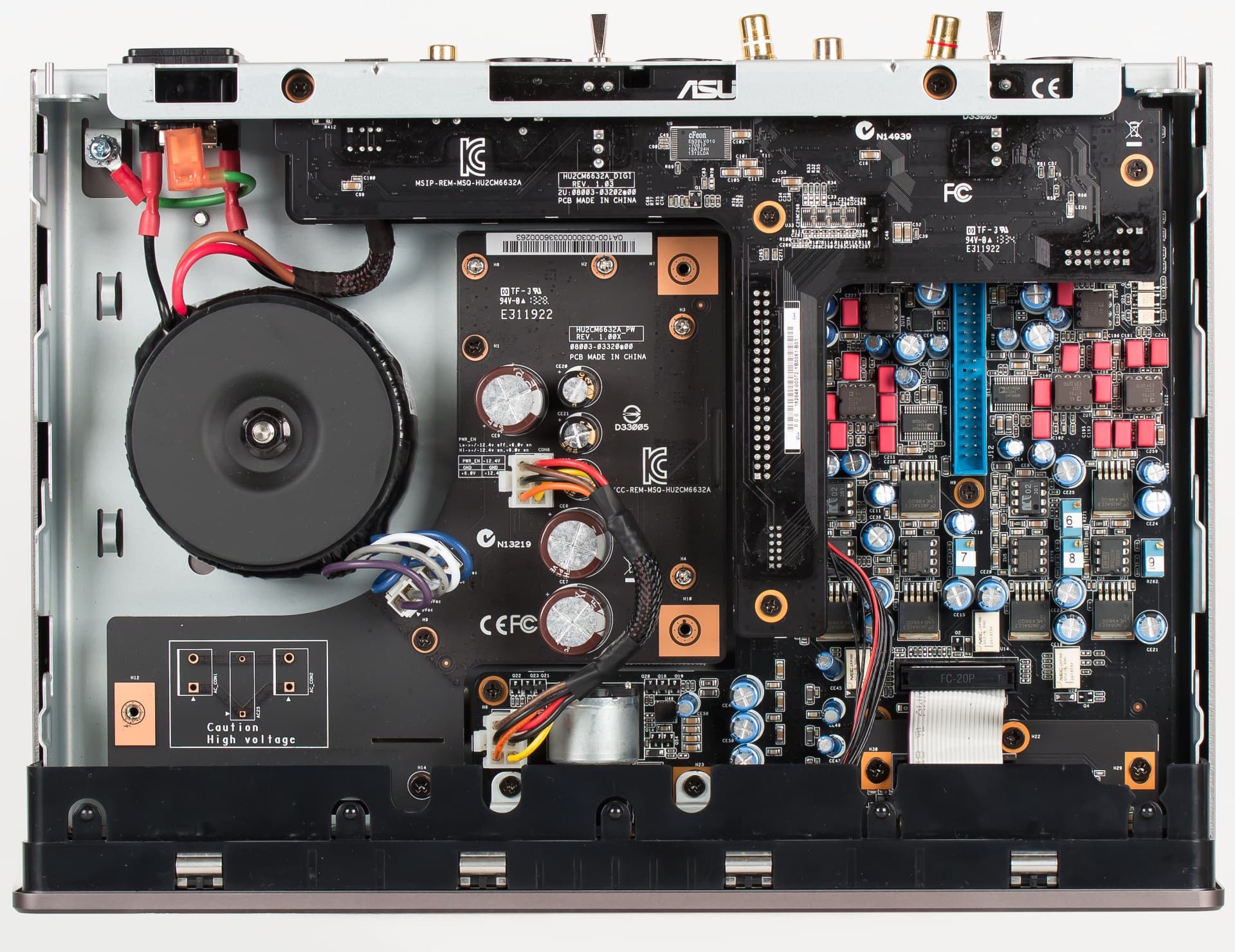4-слойные печатные платы цифровой и аналоговой части разделены не только физически, но и электрически не имеют общей земли. Там, где объединение неизбежно (например, у микросхемы ЦАП есть и цифровой вход, и аналоговый выход), дорожки укорочены по длине. Также дорожки заключены в «сэндвич» из земляных слоев, чтобы исключить наводки.
