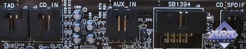 Хорошо видны входные и выходные разъёмы миниджек, а также 2 разъёма SB1394 (на самом деле разъём стандартный и полностью соответствует спецификации IEEE 1394). Широкий разъём с тремя рядами контактов служит для подключения внешнего модуля. Во второй порт SB1394 включается провод, также идущий к внешнему модулю.