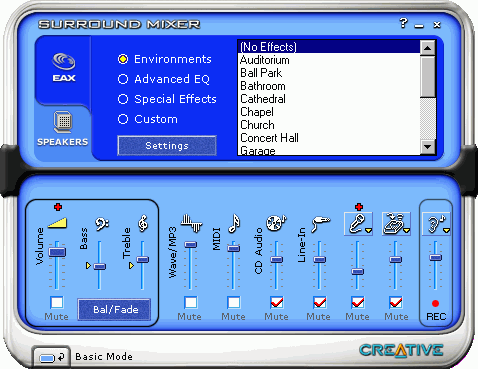 Итак, в новых платах применяется рендеринг объемного звука на базе технологии Environmental Audio eXtension (EAX), что обеспечивает "живой" реализм звука. Разработанная Creative платформа Environmental Audio Platform (EAX SDK) пользуется широкой поддержкой в отрасли, в том числе таких ведущих разработчиков, как Electronic Arts, Activision, DreamWorks Interactive и MicroProse. Хотя, по сравнению с конкурентами, 3D звук на 2-х колонках и в наушниках при применении EAX 1.0 не очень впечатлял, а вот 4-колоночная конфигурация ввиду качественно реализованного панорамирования звучала неплохо. Самое же главное, что EAX API можно было запрограммировать легче лёгкого! К тому же, на любую не EAX игру или любой воспроизводящийся звук в реальном времени можно было наложить эффекты реверберации профессионального качества, что давало определённую новизну ощущений. Старые игры слушались свежо.