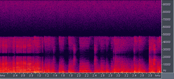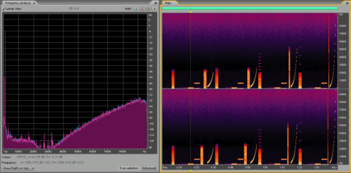 На спектрограмме приведен спектр сигнала 16 бит с SPDIF с тоном 15 кГц. На общем фоне искажений видно и паразитную гармонику высокого уровня на 19 кГц.